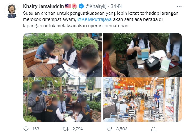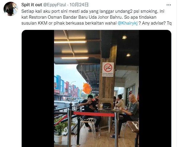 前日有网民在推特账号,标签卫生部长凯里,指在新山有民众公然在餐馆内吸烟。