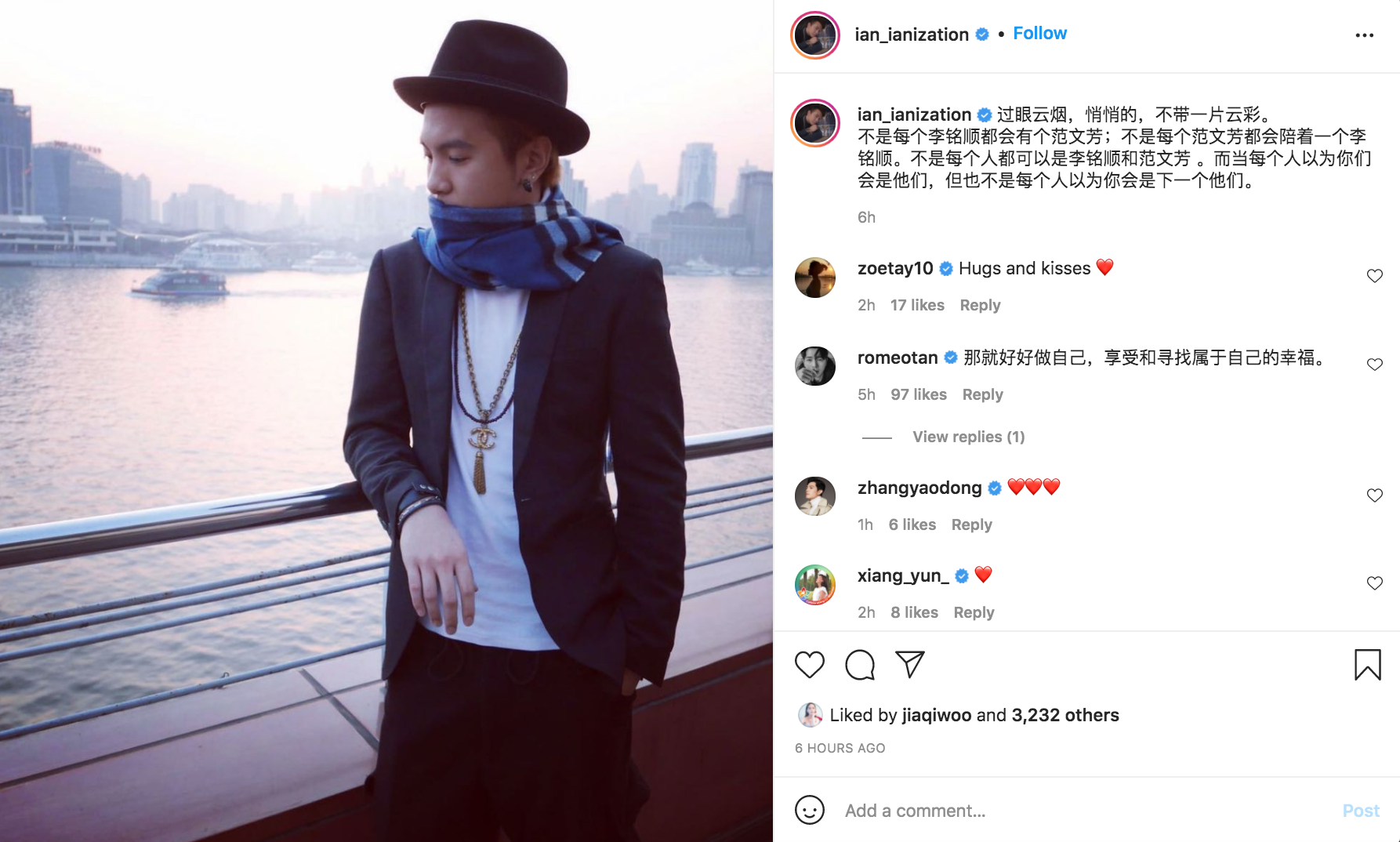 其中,在林慧玲公布喜讯前,方伟杰便在IG贴文:“过眼云烟,悄悄的,不带走一片云彩。不是每个李铭顺都会有个范文芳,不是每个范文芳都会陪着一个李铭顺。不是每个人都可以是李铭顺和范文芳。而当每个人以为你们会是他们,但也不是每个人以为你会是下一个他们。”