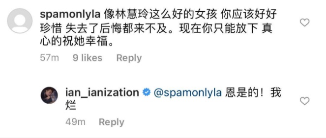 虽然如此,他仍在林慧玲的Instagram留下多个13个爱心,祝福对方。
