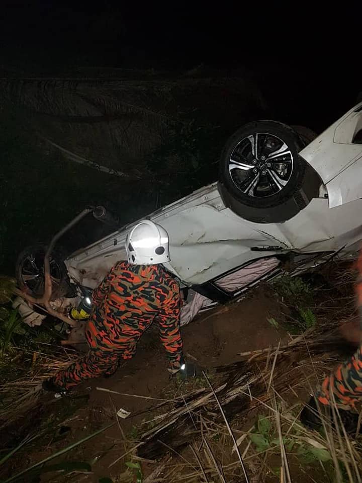 (东甲15日讯)年轻爸爸开车返家途中,疑失控坠入油棕园大沟,夹毙车内,留下妻子和2名年幼孩子。