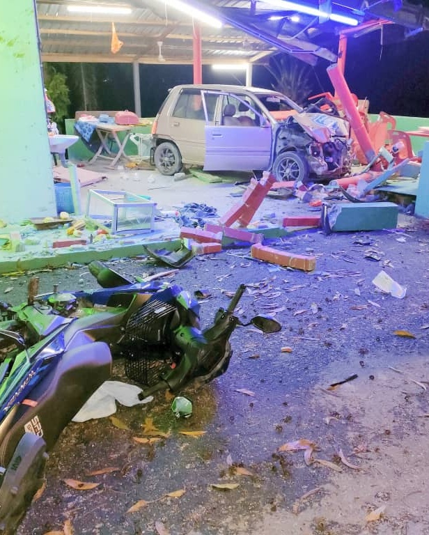 居銮警区主任刘汉生发文告指出,初步调查,相信是巫裔男子驾驶轿车往加亨镇上途中,撞上与一只突然冲出道路的野狗,以致轿车失控撞向路边食摊前的摩哆,再冲入食摊撞倒柱子。