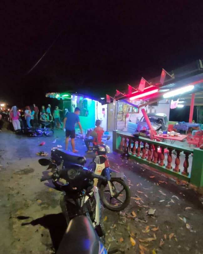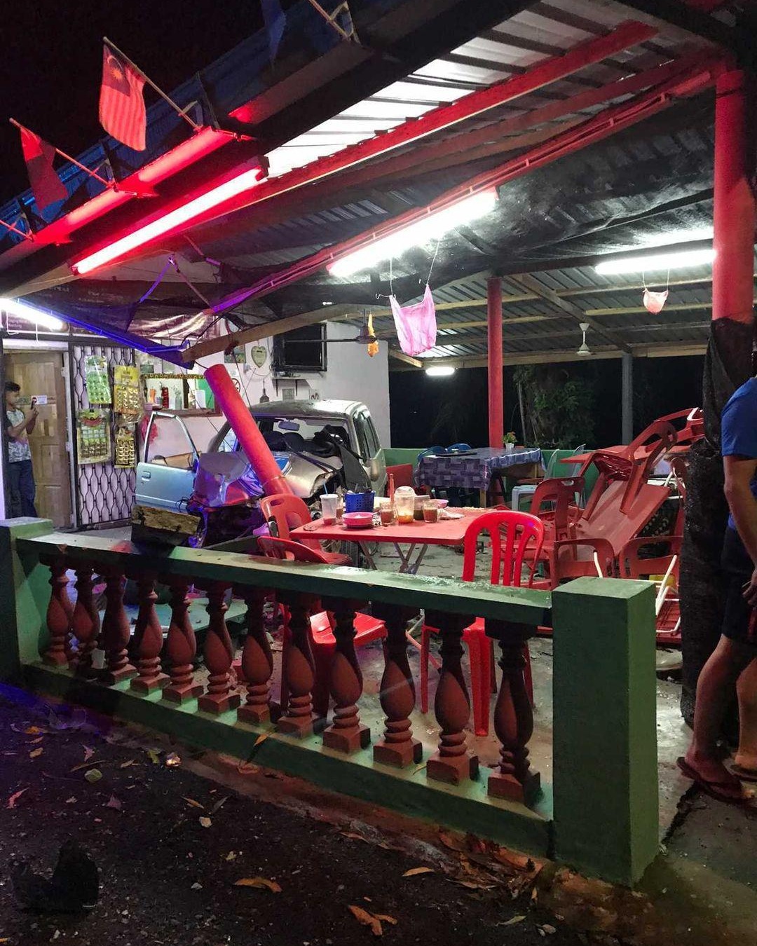 另外,“Aku Budak Kluang”面子书上载的照片可见,食摊的石柱和围栏都遭撞毁,一辆摩哆也被撞倒地,现场一片混乱。