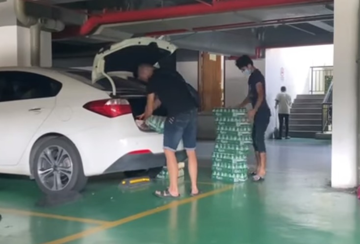这长2分21秒的视频,可见数名男子轮流搬运相信是啤酒的货,塞进一辆车后厢,轿车则泊在一栋建筑物泊车场。