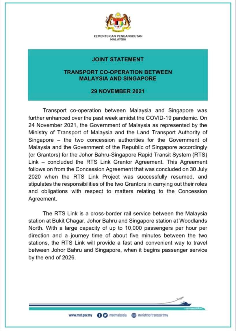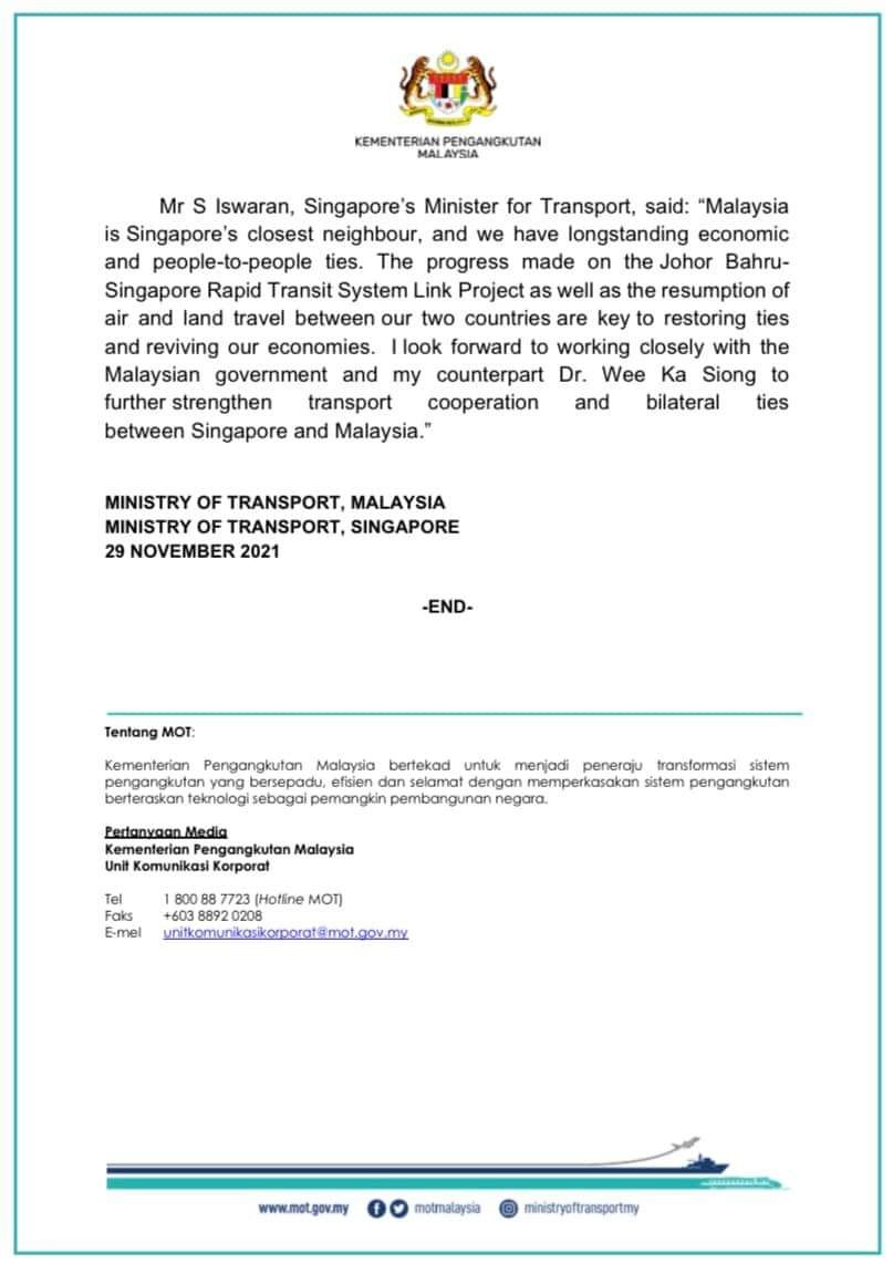 今日,我国交通部长拿督斯里魏家祥和新加坡交通部长易华仁,便一同出席新柔捷运系统授予者协议(grantor agreement)签署仪式,以及陆路和航空“疫苗接种旅游通道”(VTL)的推介礼。