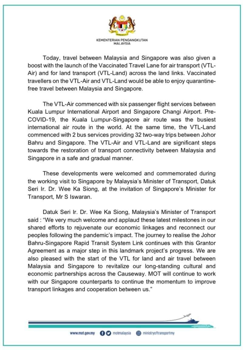 他说,马新VTL从今天开启,这项通道除了让两国人民能够和家人团聚,重开边境也将能振兴和巩固两国经济。