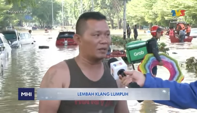 (巴生21日讯)Grabfood哥好抢镜,水灾拿着泳圈继续送餐!