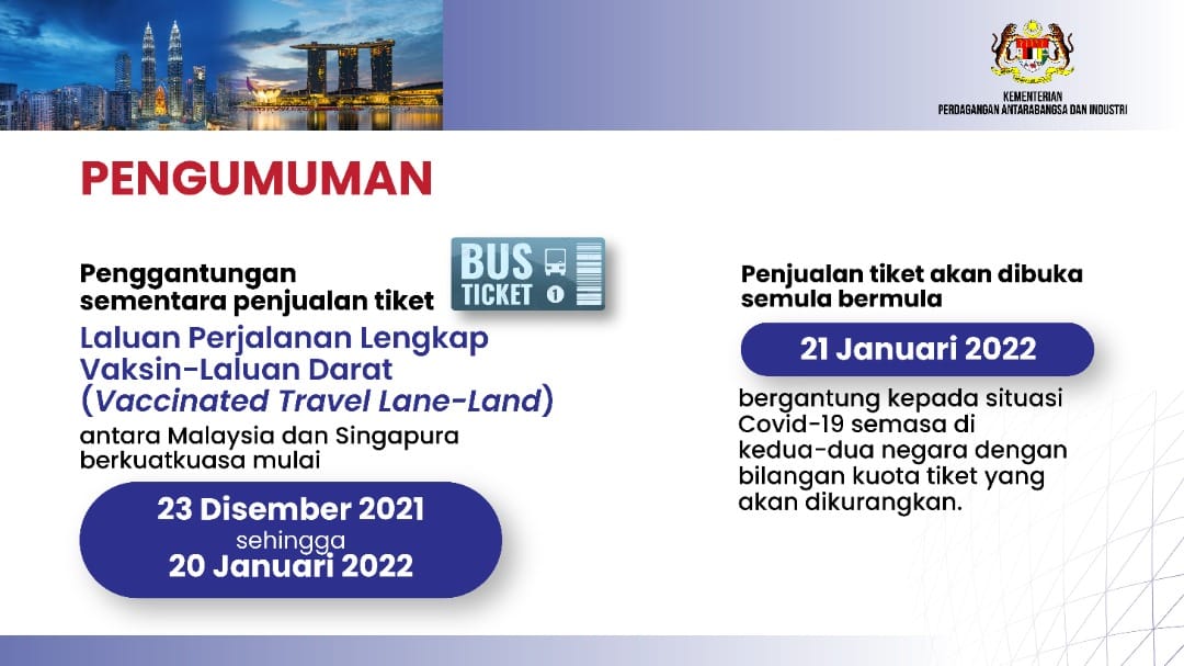 国际贸易及工业部和卫生部今午联合发出通告,指马新陆路VTL的巴士车票,将于12月23日至1月20日暂停销售。