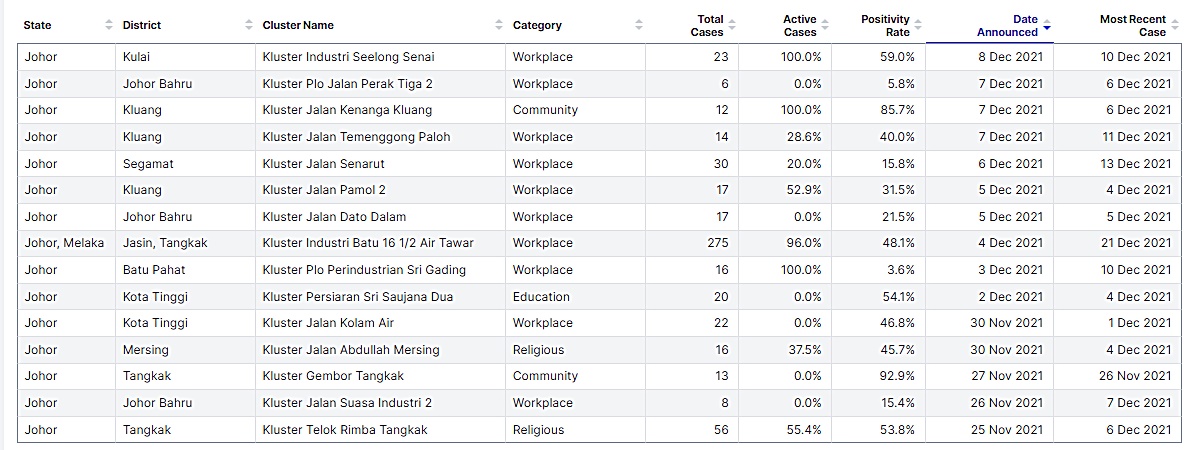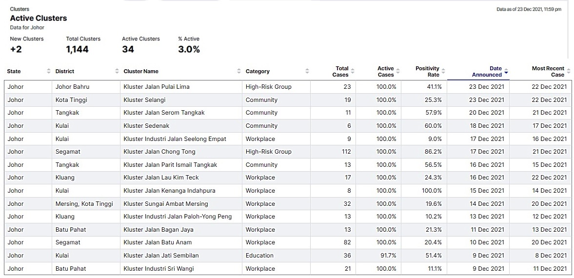 截至昨日,柔佛共有1144个感染群,还活跃被观察的34个(2个高风险、2个宗教、3个教育、7个社区、20个职场)。
