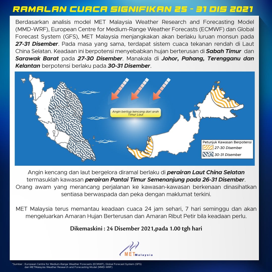 气象局通告指出,根据当局、欧洲中期天气预报中心(European Centre for Medium-Range Weather Forecasts,ECMWF)和全球预报系统(GFS)分析,12月27日至31日出现季风吹向大马的现象。