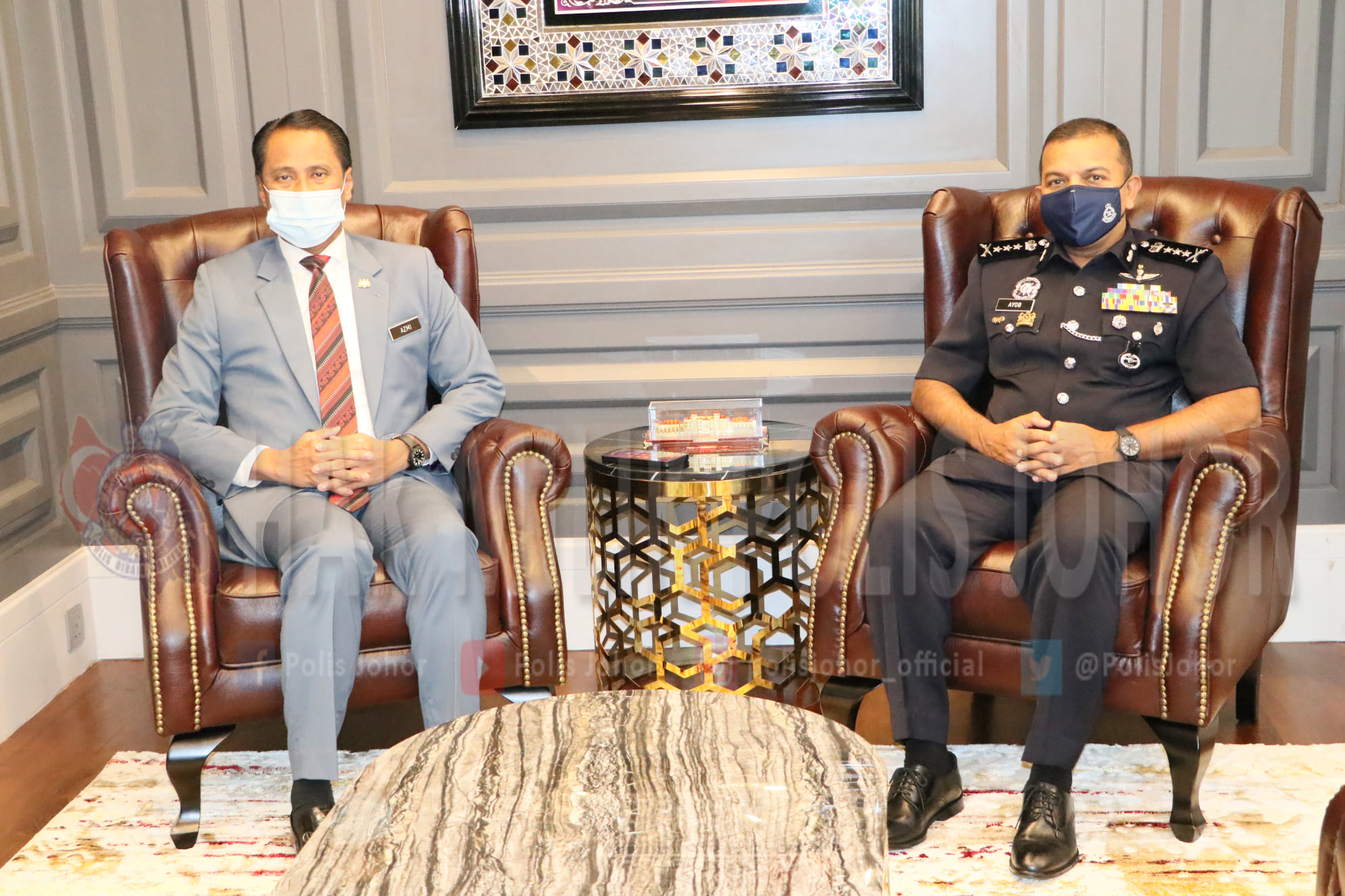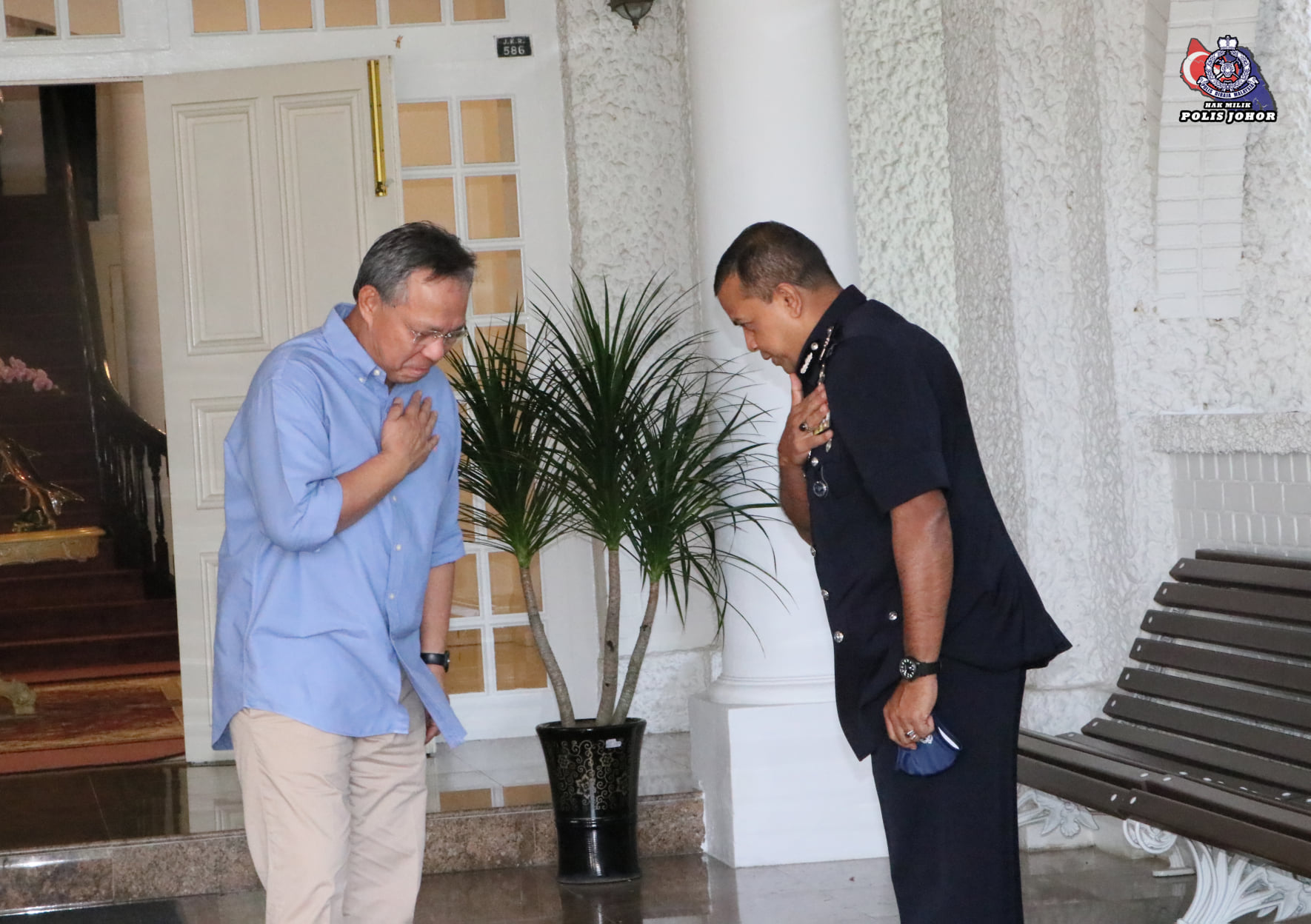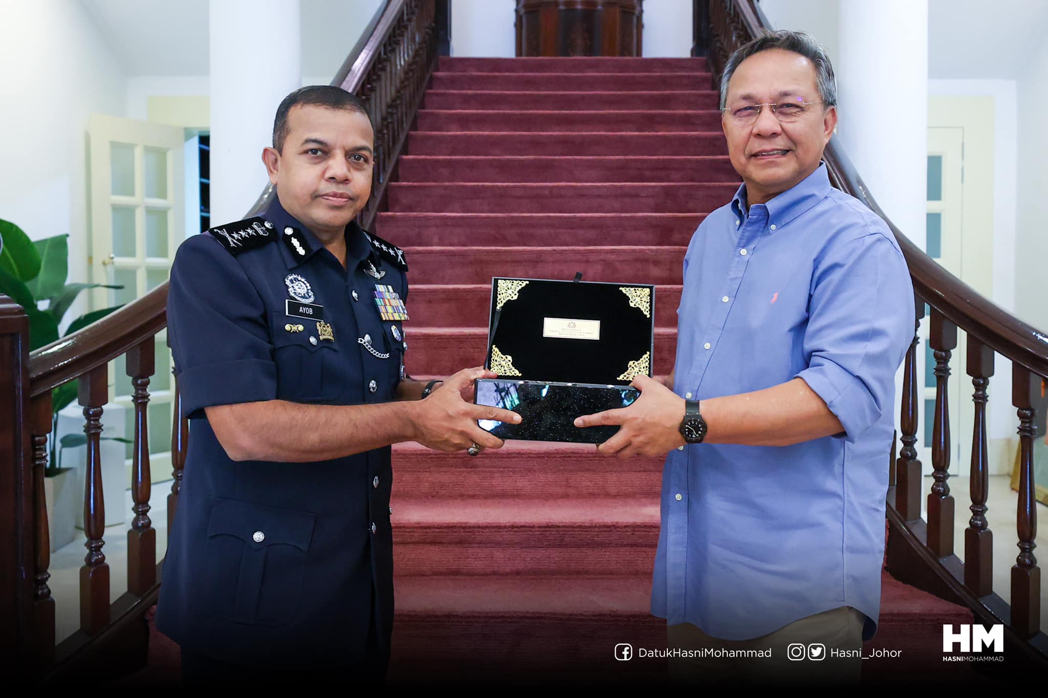 今日柔佛警方面子书已上载,阿育甘向柔州一些领袖告别的照片,包括亲自前往柔佛州务大臣拿督哈斯尼官邸,也拜会了柔州秘书拿督阿兹米、柔佛宗教司局(Jabatan Mufti Johor)的拿督耶亚阿末宗教司。
