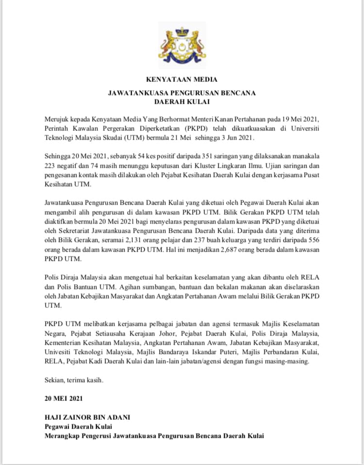 (古来20日讯)士姑来马来西亚工艺大学(UTM)确诊人数再上升,至今有54人确诊,74人尚待检测报告出炉,并于明日(5月21日)至6月3日,落实强化行动管制令(EMCO/PKPD)。