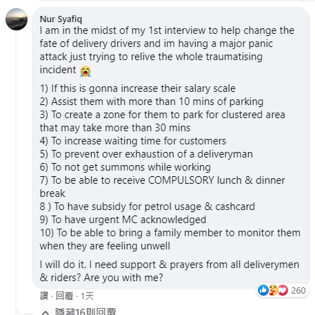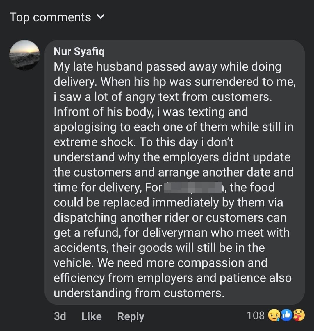 前日(19日)“Wake Up, Singapore”面子书上载女子Nur Syafiq的经历,指丈夫送餐途中逝世,当她站在丈夫的尸体前,拿着丈夫的手机,看到一些顾客发来的愤怒短信。