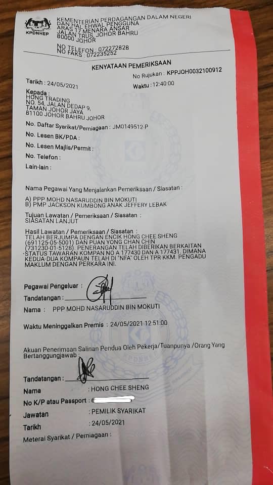社会时事 店里没顾客脱口罩 业者夫妇上诉得直 1000罚单取消 2021 年 5 月 25 日2021 年 5 月 25 日 (新山25日讯)店里没顾客,业者脱下口罩遭开罚单,上诉成功免罚1000令吉! 马华巴西古当区会主席陈传平,今日在面子书上告知,早前(3月)柔佛再也花园一间校服店业者夫妻申诉,在没有顾客光顾的情况下,遭贸消局执法人员上门检举,并以工作时没有戴口罩为由,当场各给每人各出1000令吉罚单。 他说,经过记者会及向贸消部投诉后,今天官员带上取消罚单的通知书到商店交给业者夫妇。 他强调:“没犯错,就应该勇敢站出来反映,公道自在。” 图:陈传平面子书 ↓↓最近新闻↓↓ 分享 Facebook Twitter Pinterest Linkedin