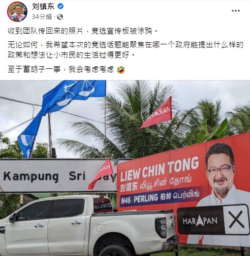 (新山4日讯)竞选看板遭涂改,刘镇东风趣回应:“蓄胡子一事,我会考虑考虑。”