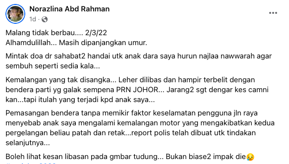 昨天(4日)便有一名母亲诺拉芝丽娜在面子书贴文,指其女儿骑摩哆时,便险些遭竞选旗子夺命。