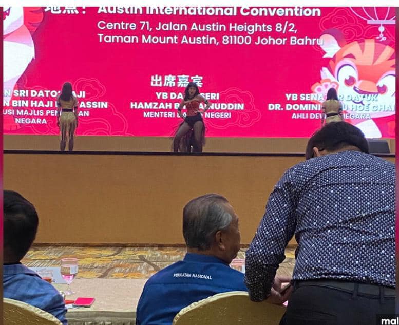(新山6日讯)丹斯里慕尤丹为首的国盟领袖,出席“华社交流晚宴”时,台上因出现性感辣妹热舞, 遭到群起围剿,伊斯兰党国会议员凯鲁丁促请主办单位道歉。