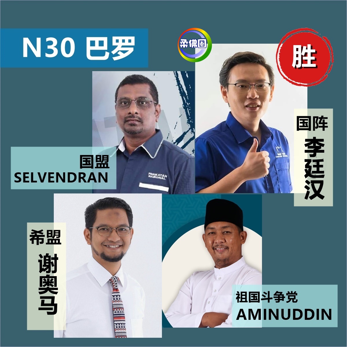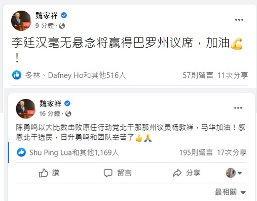 他也宣布陈勇鸣在北干那那报捷,同时指巴罗州席的李廷汉胜选已无悬念,事后也宣布陈宗赢下彼咯。
