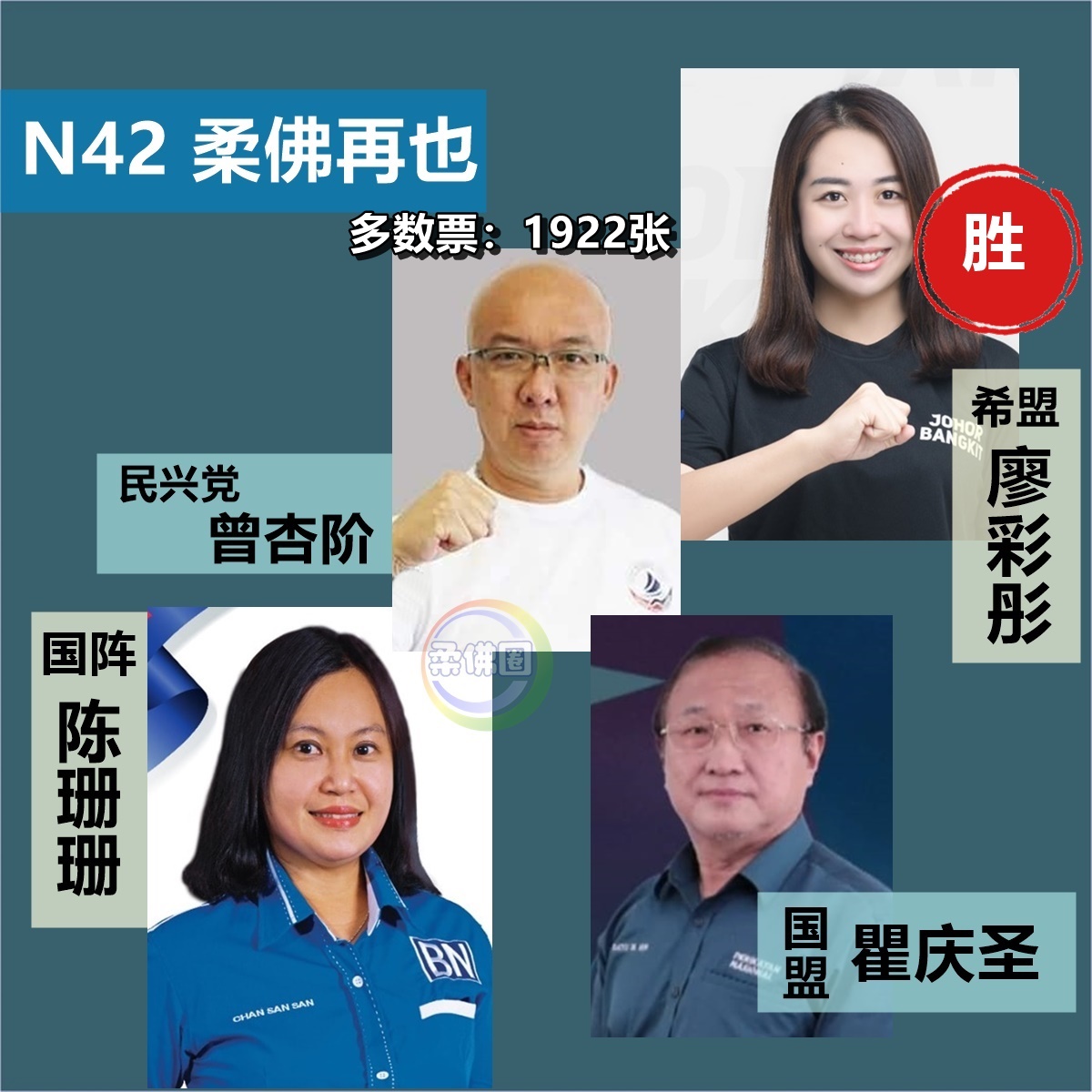 最受瞩的柔佛再也州席,廖彩彤更是仅以1922张多数票胜选,廖彩彤获19,782票,马华陈珊珊17,860票、民政瞿庆圣8307票、民兴党曾杏阶1,448票。