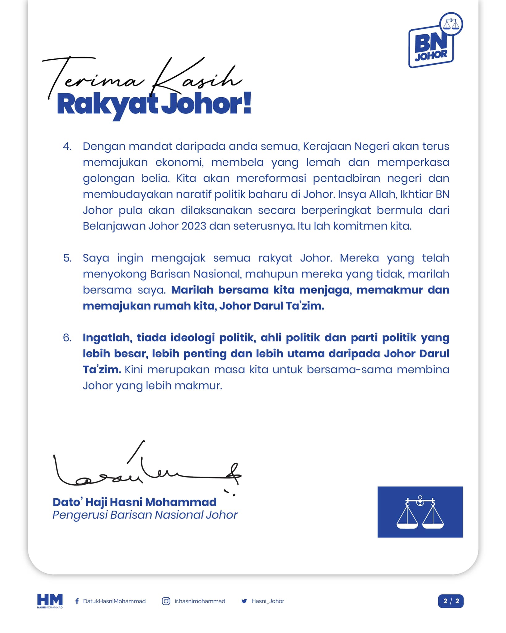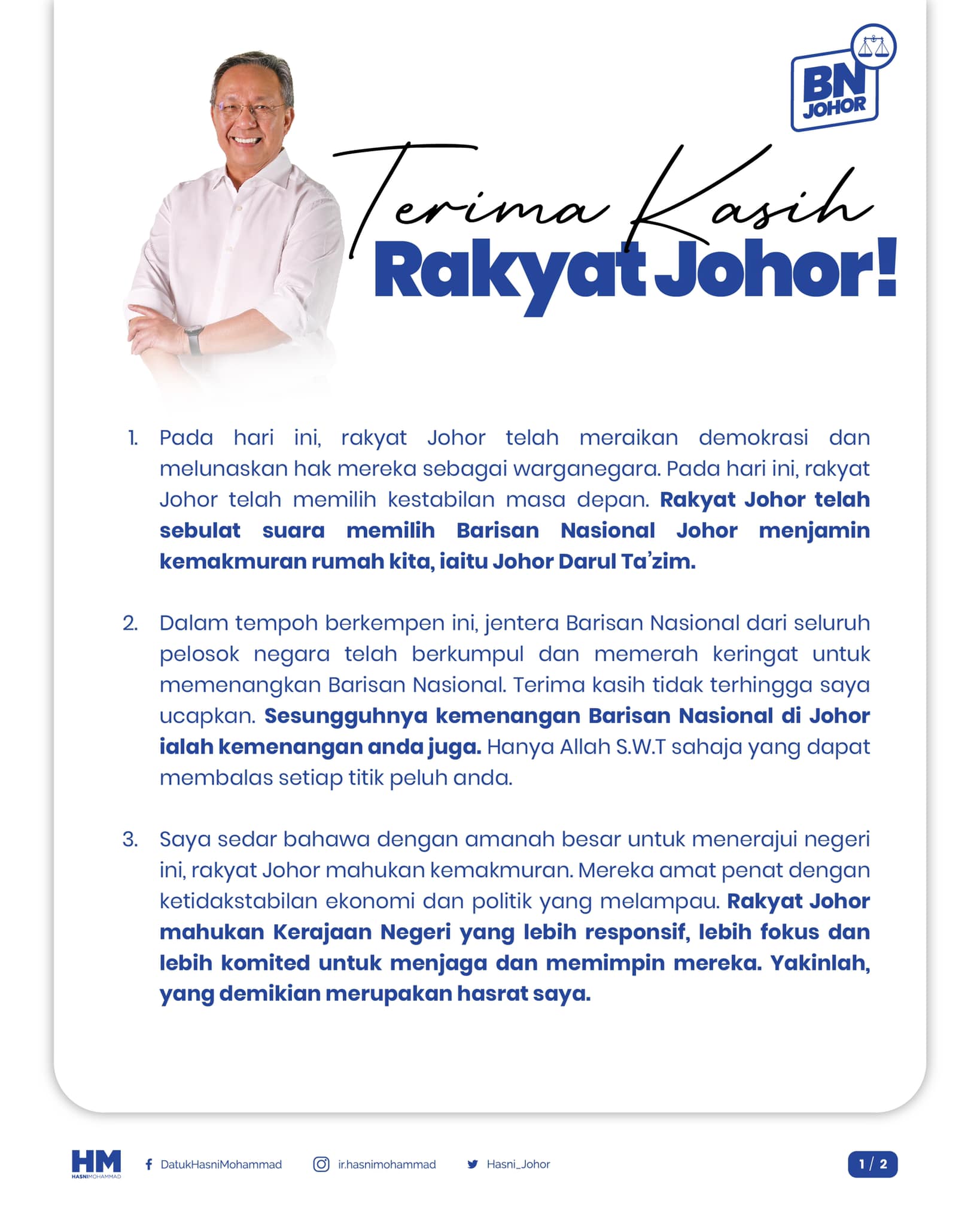 唯首相拿督斯里依斯迈沙比里还是在社交媒体,祝贺国阵在柔州选举胜利,并感谢所有选民、领袖、竞选机制工作人员等。