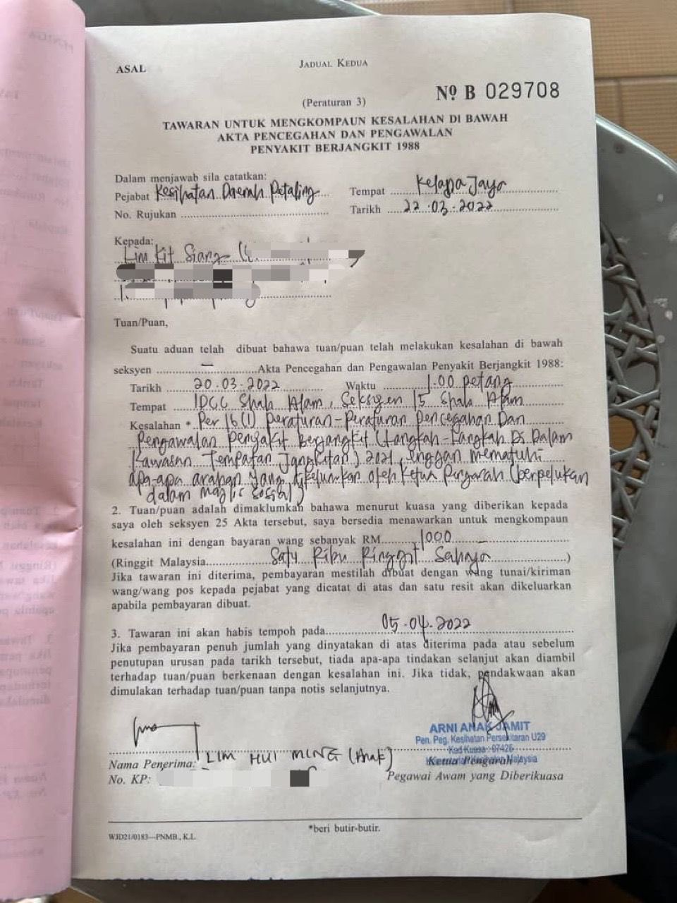 罚单由八打灵生局今日发出,罚款额1000令吉,并指林吉祥于3月20日下午1时,在民主行动党代表大会违反防疫标准作业程序拥抱。
