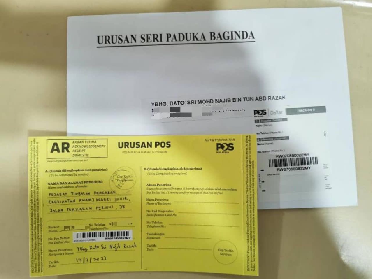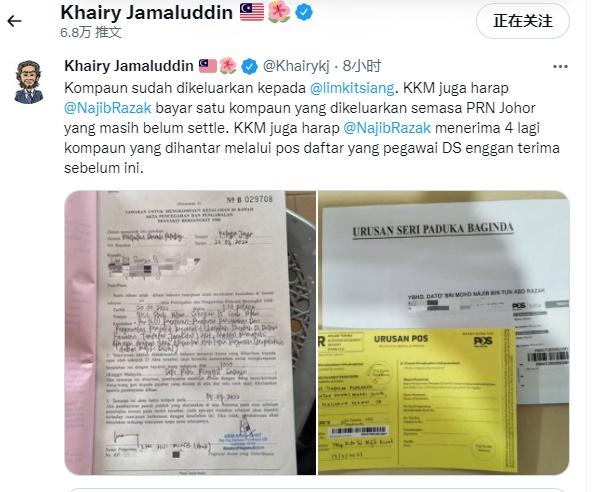 他说,纳吉在柔佛州选期间,一张罚单已收下却尚未缴还,还有4张则是遭助理拒收。