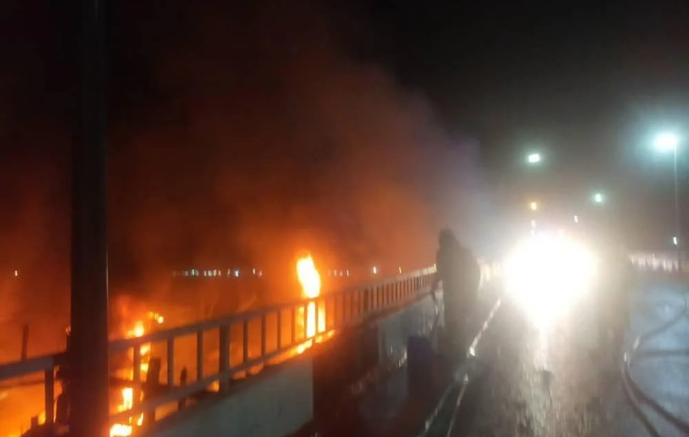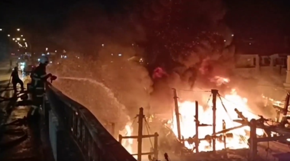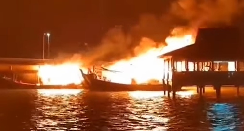 (丰盛港3日讯) 兴楼丹绒哥莫码头(Jeti Tanjung Gemok)陷入一片火海,消拯员耗10小时扑灭火势。