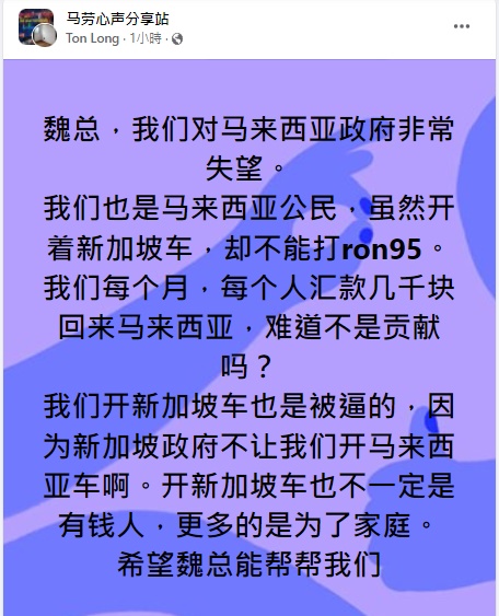 “魏总,我们对马来西亚政府非常失望。我们也是马来西亚公民,虽然开着新加坡车,却不能打ron95。我们每个月,每个人汇款几千块回来马来西亚,难道不是贡献吗?”
