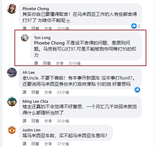 大多数网民不认同,驾驶新加坡轿车的大马人,可获准添购RON95补贴汽油,留言摘录如下: