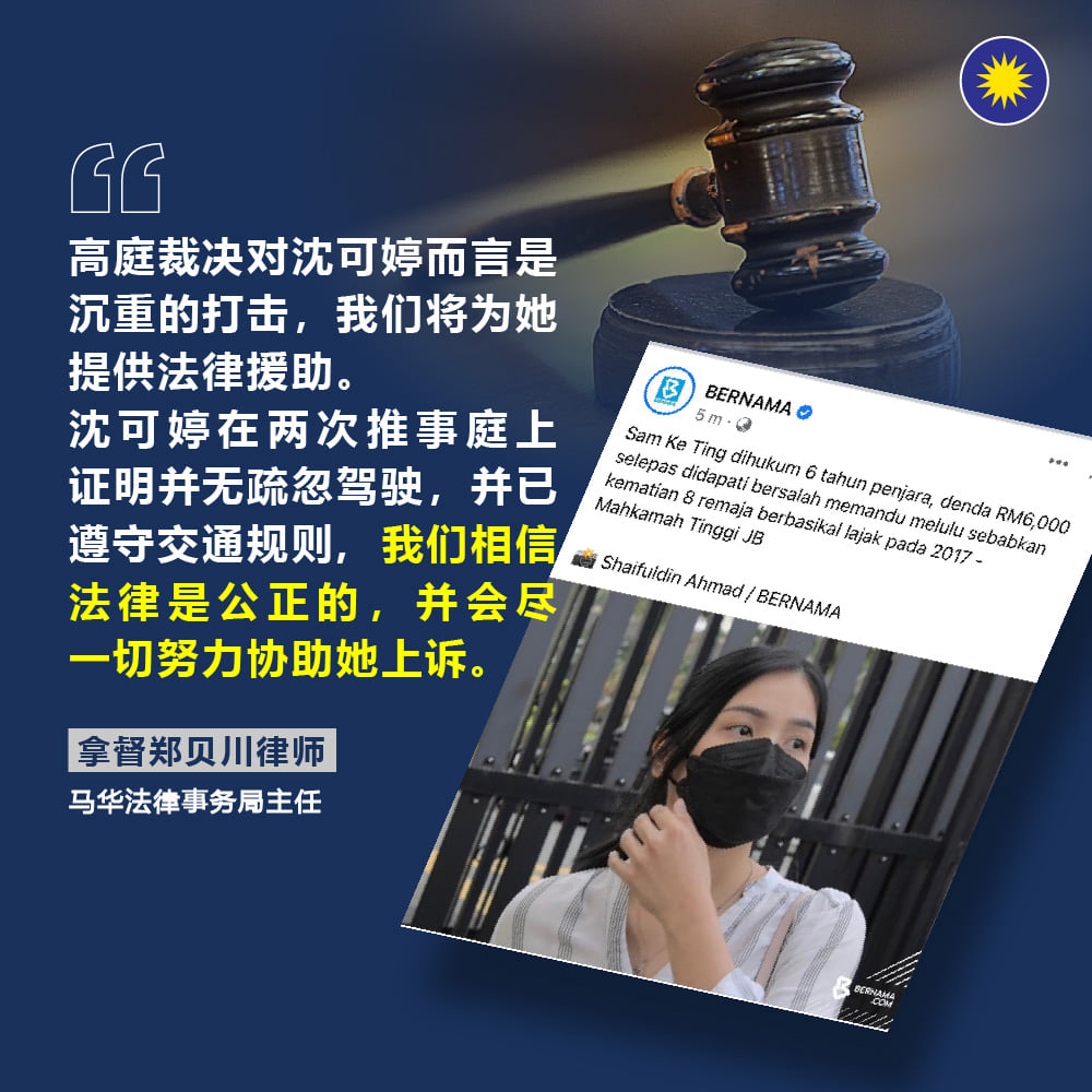郑贝川今日发表文告指出,随着新山高庭就8名少年骑蚊型脚车遭撞死车祸上诉案中,判被告沈可婷疏忽驾驶导致他人死亡罪名成立一事,马华将为沈可婷提供法律援助,包括协助她上诉,确保她获得公平公正的裁决。