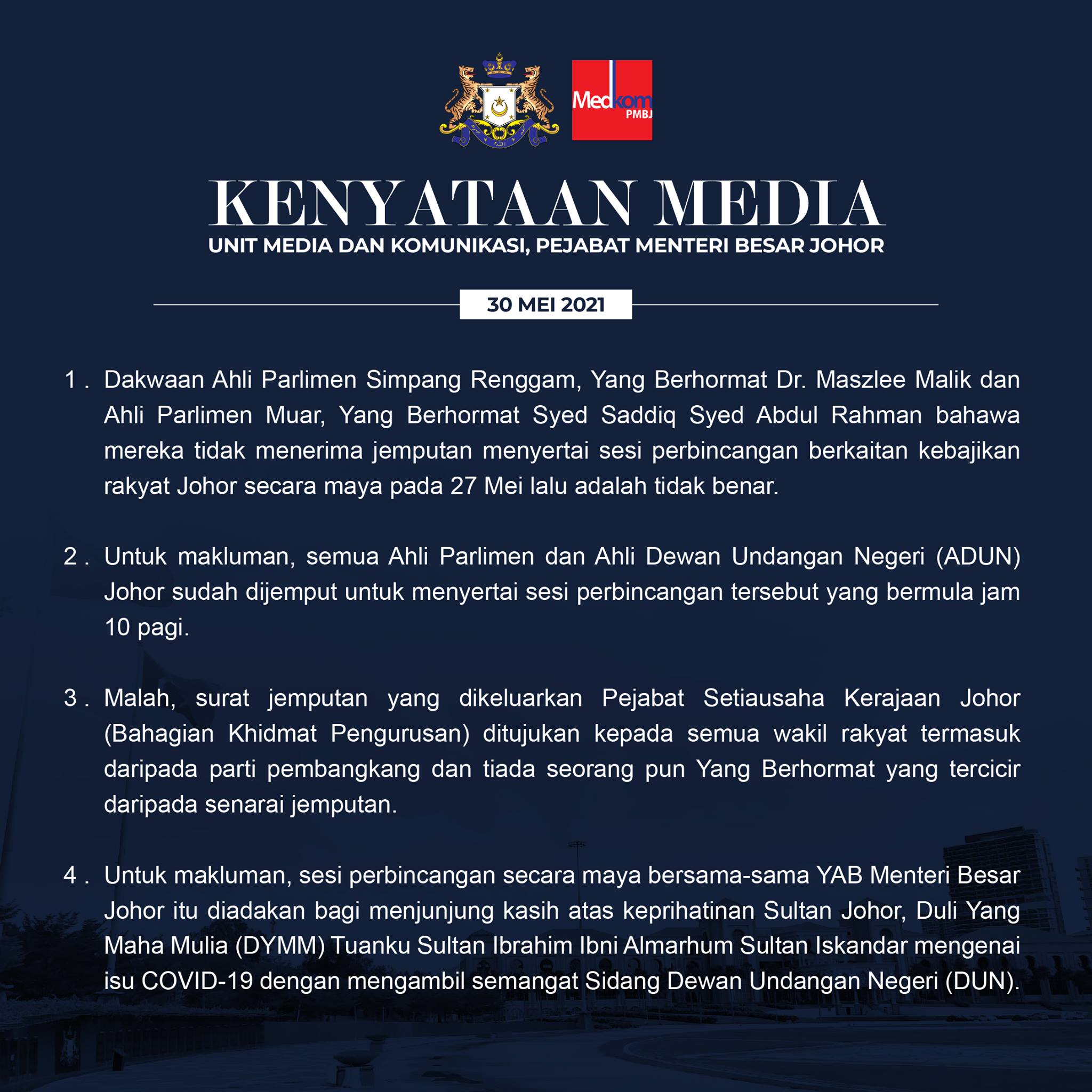 (新山30日讯)针对国会议员马智礼和赛沙迪申诉,没接获受邀或被拒绝参与5月27日的国州议员线上抗疫会议,柔佛州务大臣署新闻及通讯组今日发文告,驳斥指有关指控不实。