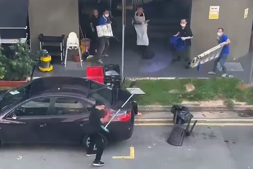 (新加坡15日讯)男子持刀到火锅店,当街狂砍前妻,逾十名目击者迫切救人,手持“架撑”如梯子、垃圾桶、告示牌、椅子、烧烤盘等随手可取的物件,纷抛向凶徒驱赶。