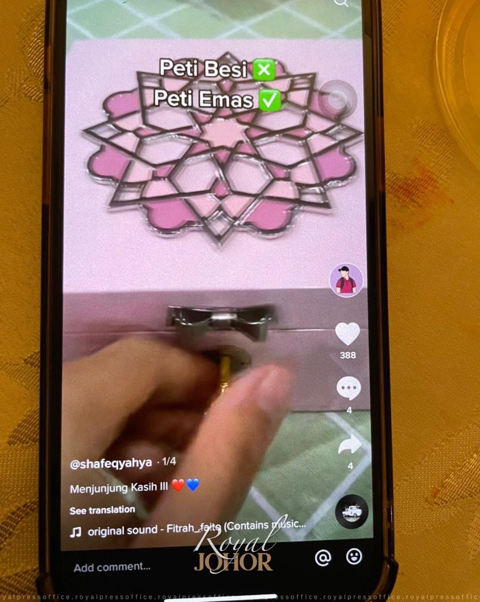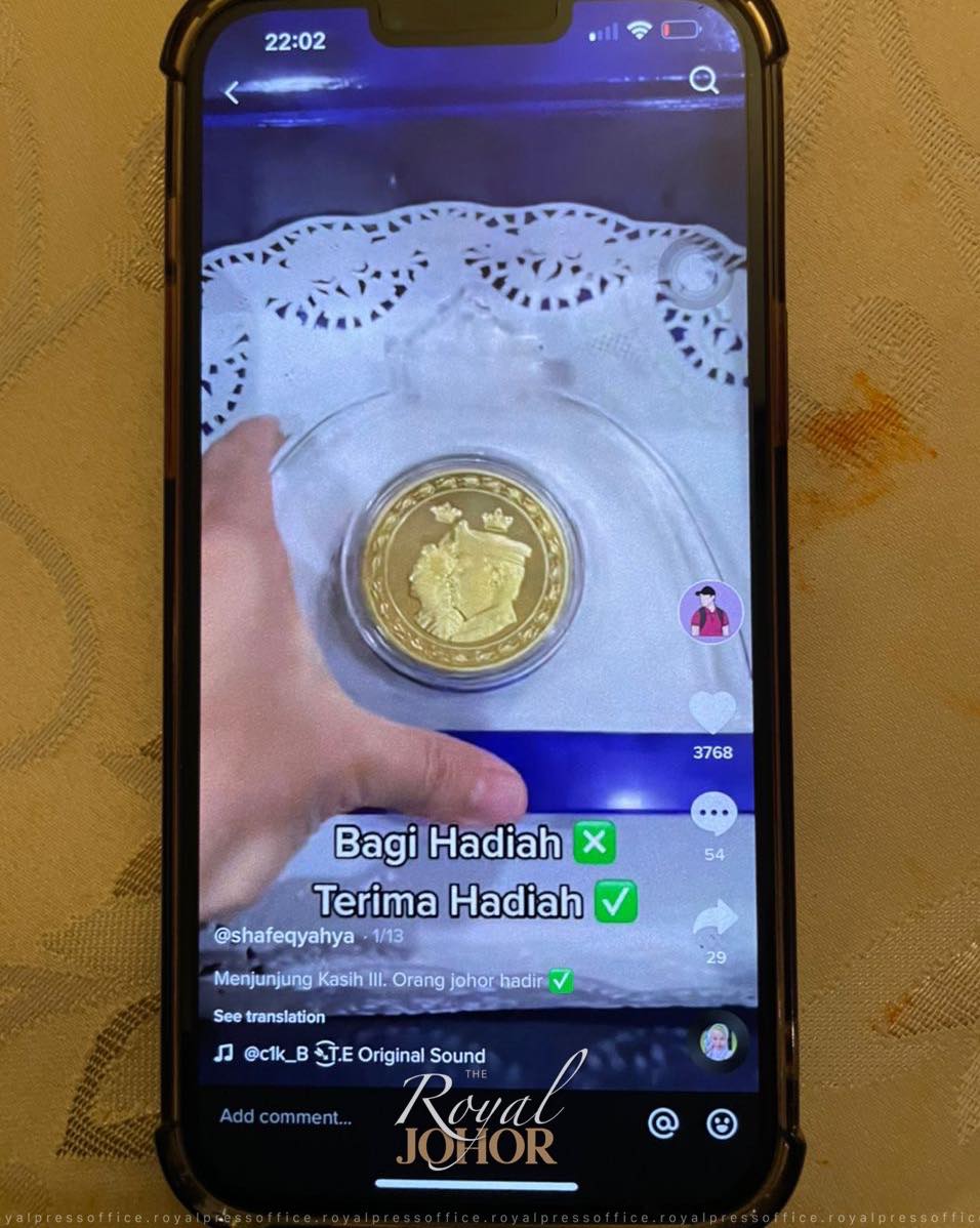 据了解,“shafeqyahya”的tiktok账,自去年开始,偶尔会亮出由新山武吉士林王宫所赐的礼物,并在tiktok上展示,礼物有金币、笔、礼盒、坠子等。