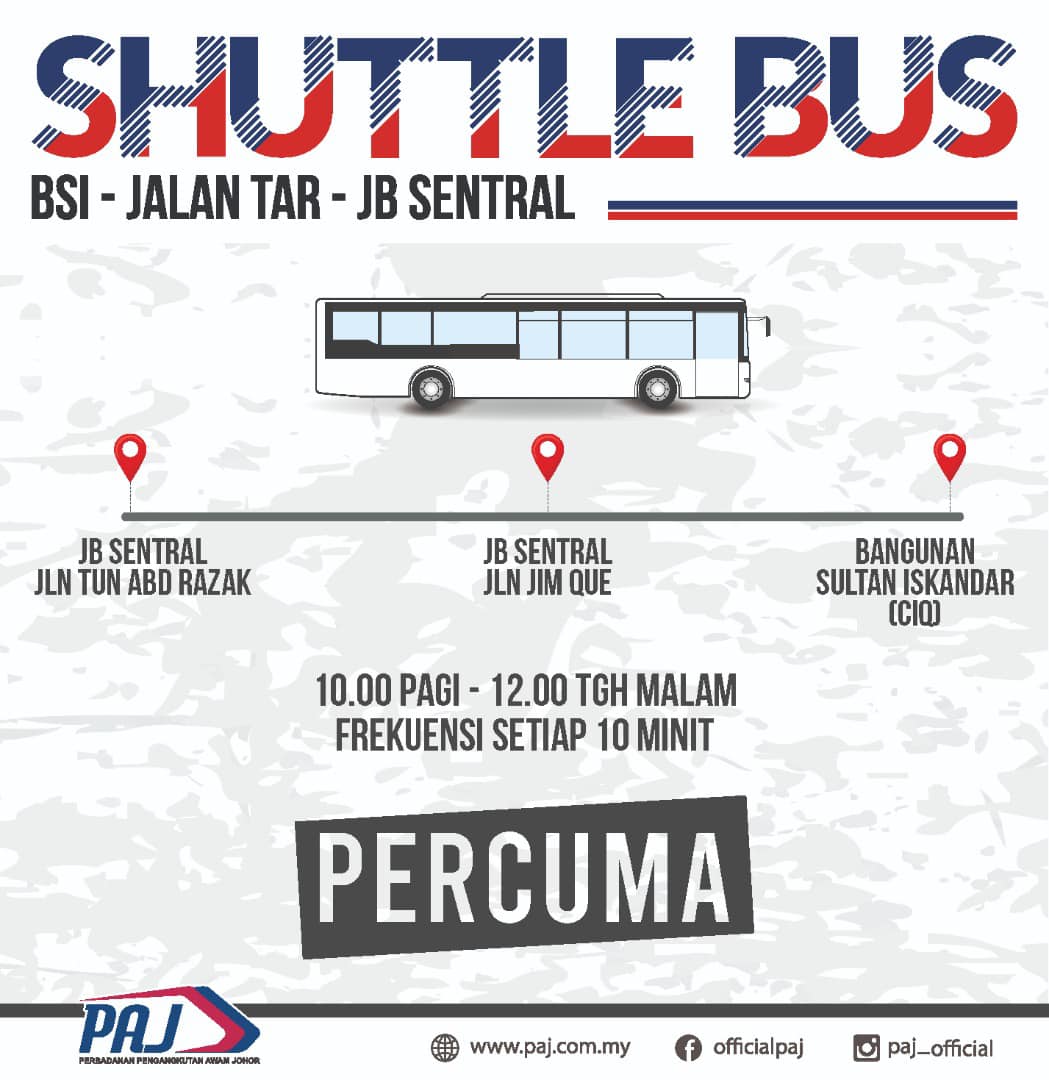 柔佛州公共交通机构今日在面子书宣布,免费短程巴士从早上10时至凌晨12时服务,行驶路线为敦阿都拉萨路(JB Sentral 新山中环综合车站)、仁贵路(JB Sentral 新山中环综合车站)、苏丹依斯干达大厦(BSI,CIQ)。
