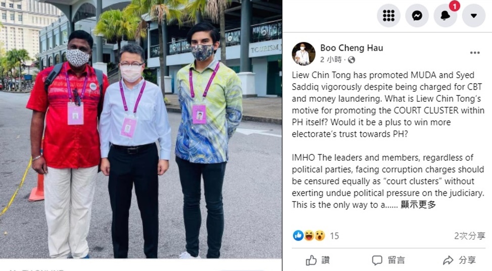他今日发文告,指个人浅见,无论来自于任何朝野政党的领袖,凡是面临贪污官司者,都不应得到礼仪优待的特权,相反的都应该面临社会舆论的批判,避免以政治势力向司法制度施压,我国才能迈向文明先进国的目标。