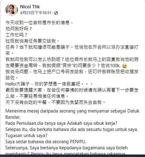 “我询问‘市长’有什么任务交给我,对方回说他的朋友因现金周转不灵,希望我可以帮忙,我客气回问需要多少,对方开口就要10万令吉。”