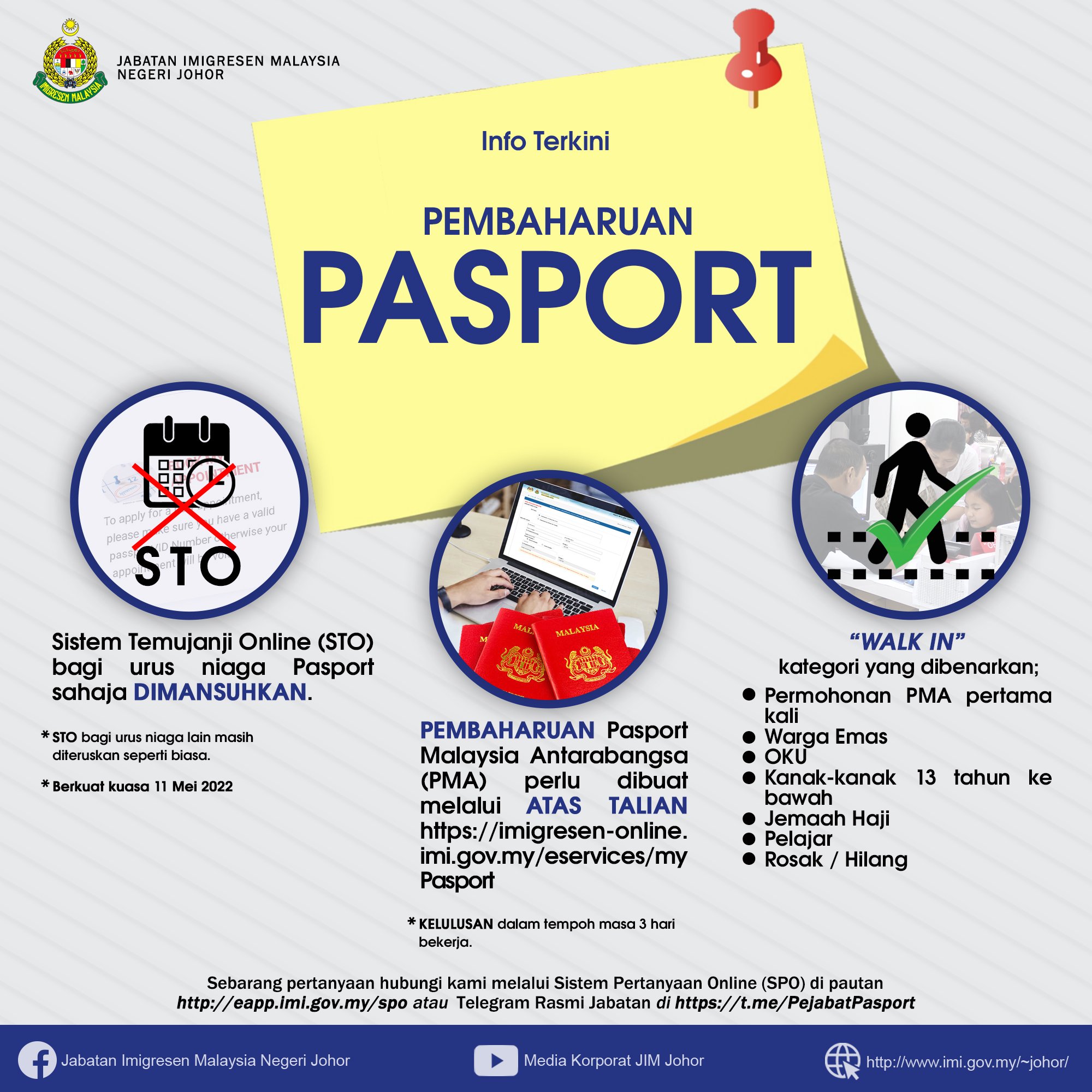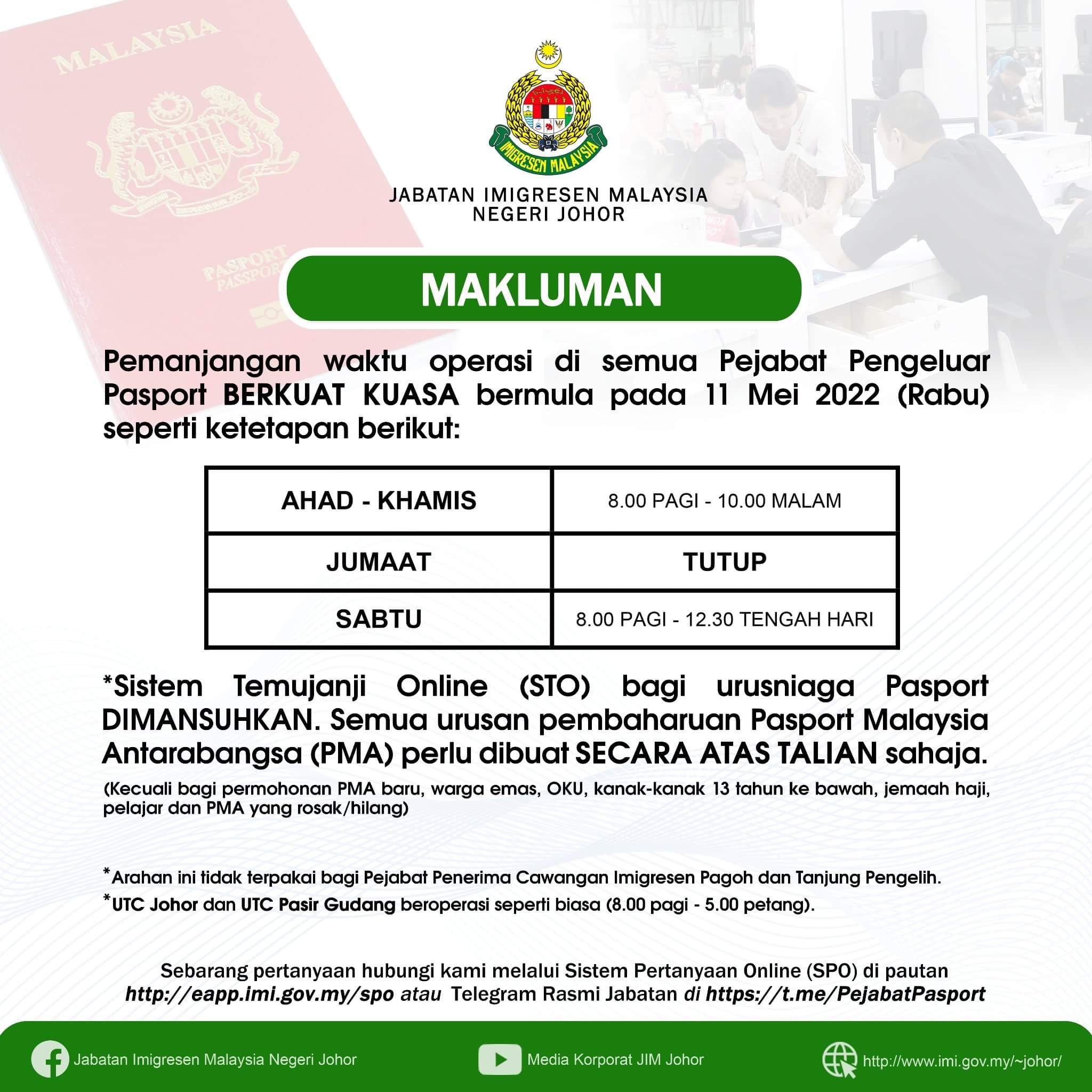 虽然柔佛移民局自5月11日起,延长了办理国际护照的服务时间,并取线了线上预约,但不意味着所有的民众皆可直接登门(Walk-in)办理护照申请手续。