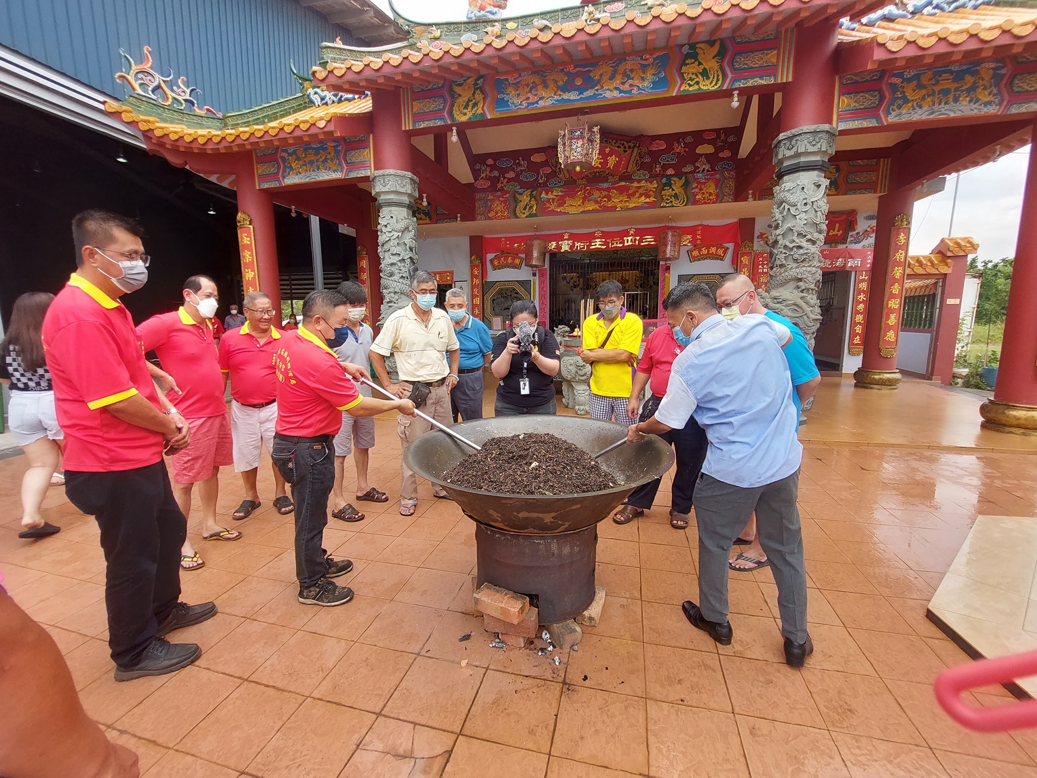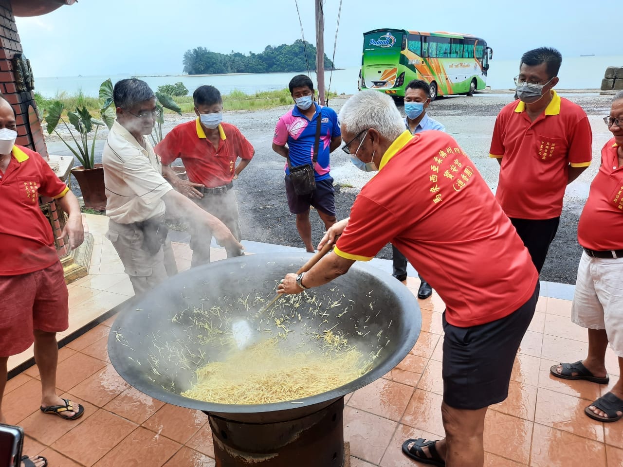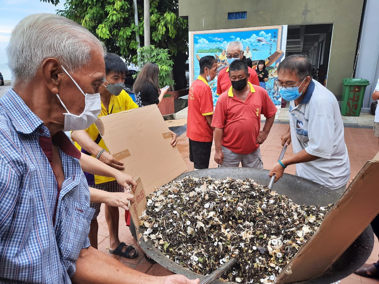 他说,炒午时茶,顾名思义就是把一些平民药材、茶叶、食材,在端午节的午时(11am到1pm)晒太阳后,全部放进大镬里,由理事们跟乡民轮流把所有的材料炒香后。
