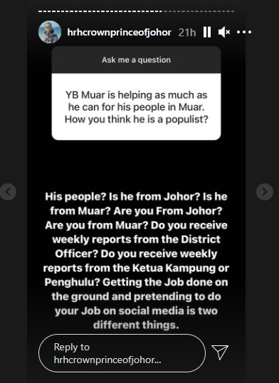 稍后有网民认为,赛沙迪有在尽力援助麻坡人民,王储反问:“他(赛沙迪)的人民?他来自柔佛来自麻坡?你(网民)是来自柔佛自麻坡吗?你有收到县长每周的报告吗?你有收到村长或社区领袖每周的报告吗?实在地服务和在社交媒体工作是两回事。”