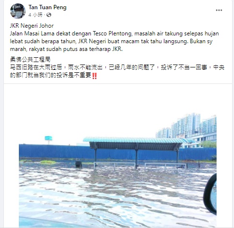 “柔佛公共工程局,吗哂旧路在大雨过后,雨水不能流出,已经几年的问题了,投诉了不当一回事,中央的部门就当我们的投诉是不重要!!”