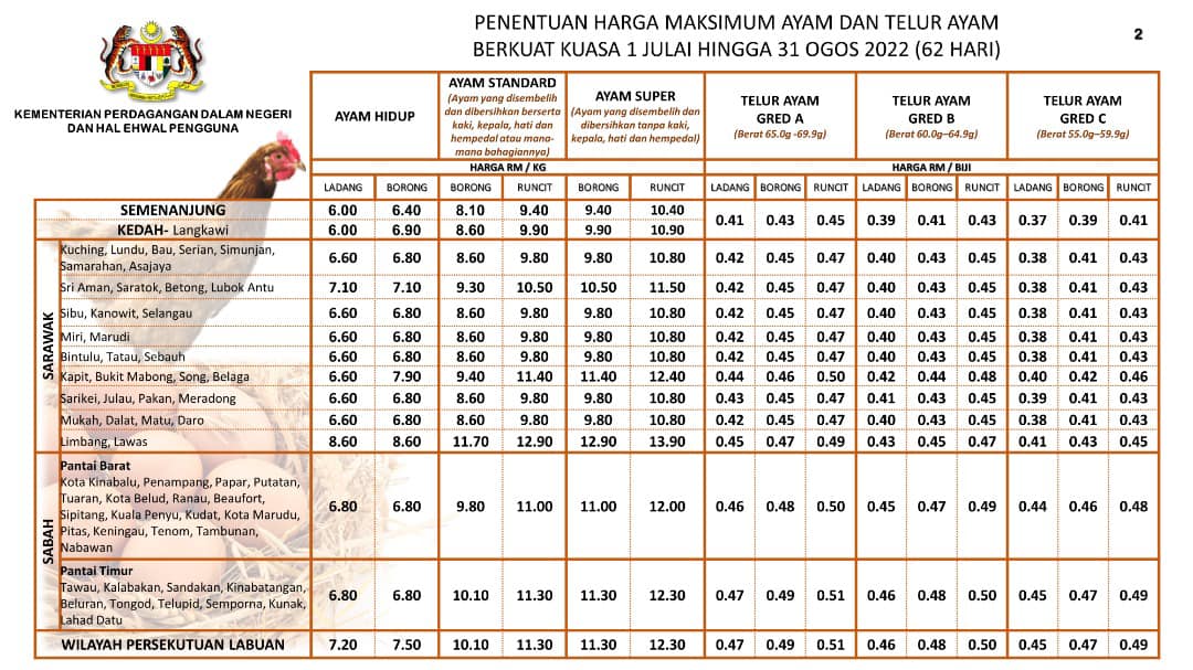 随着内阁会议日前议决,暂时不让肉鸡价格随市场浮动,并会继续提供补贴,国内贸易及消费人事务部列出全国最新的肉鸡和鸡蛋顶价。