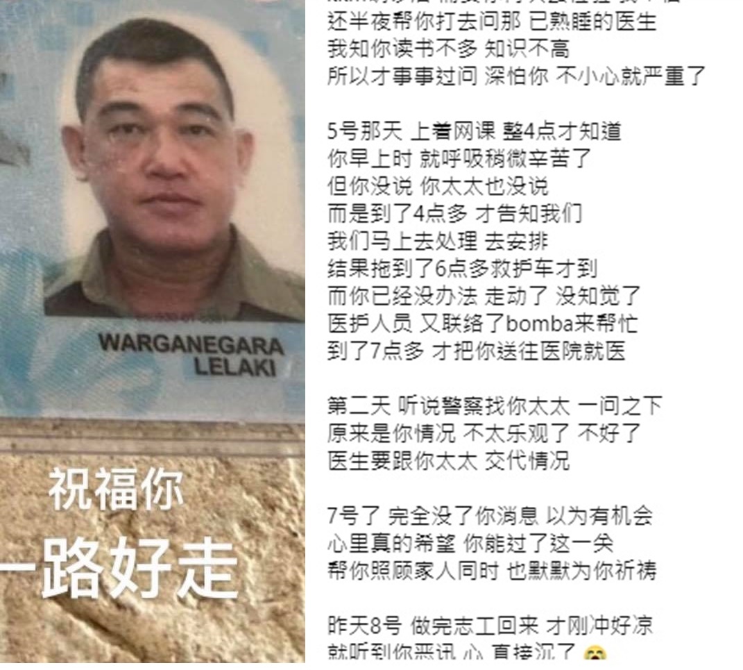 武吉甘蜜抗疫先锋队主席郑秀珊也在面子书贴文:“你走了,你确实过不了这一关,心特别的沉重。”