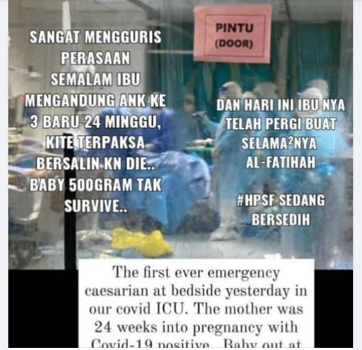 (麻坡9日讯)怀有6个月身孕的妈妈,在感染新冠肺炎后陷入昏迷,医生唯有进行手术先取出胎儿,最终早产儿没能保住,妈妈也宣告不治。