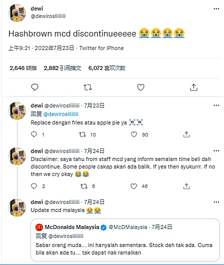 她的哀嚎引起许多网友的热议,大马麦当劳也对脆薯饼停售一事,回应:“年轻人耐心等待,这只是暂时性的,目前没有货,但何时会再有,还无法预测。”