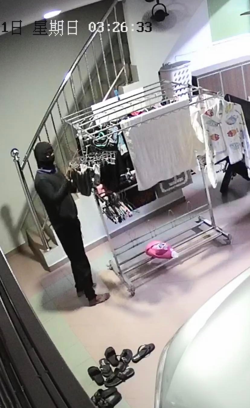 只见内衣贼全身黑打扮,并套下面罩只露出双眼,爬进屋子内便挑选内衣裤,然后塞入自己的裤内,过程不到一分钟。