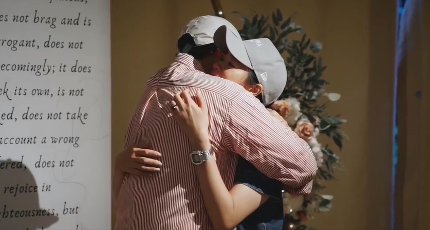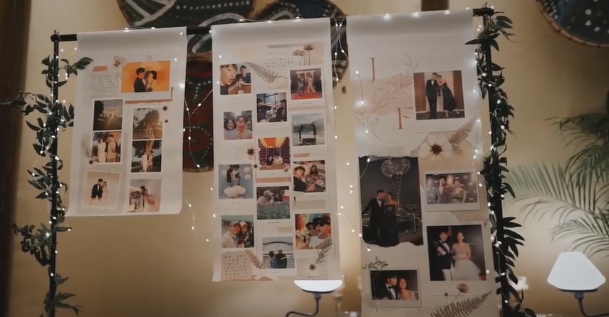 由于下雨关系,两人撑伞抵步后,可见帐篷内温馨布置,包括徐鸣杰和陈凤玲两人的合照,亲友则手持鲜花。