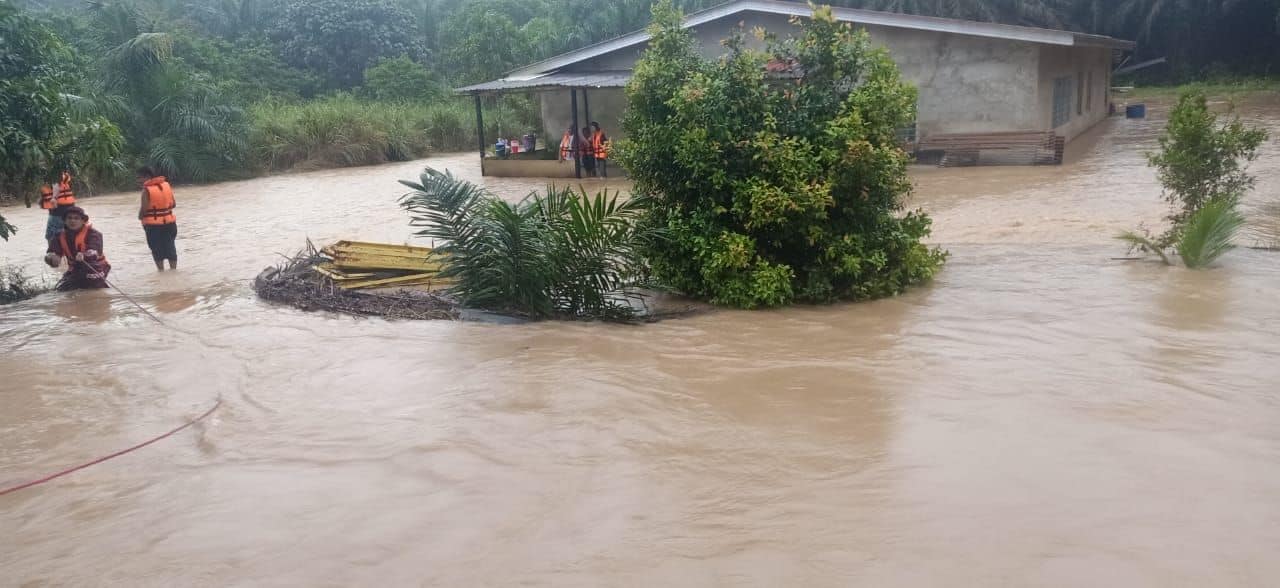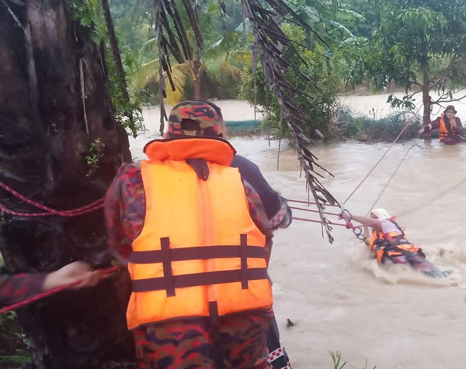 (哥打丁宜27日讯)水淹甘榜,一家六口老少被困,消拯员前往深入灾区,冒险救人也救小动物。