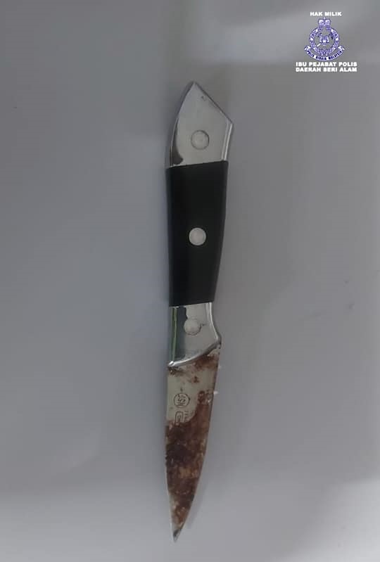 至于女子的脸部、右手臂、手腕和右肋骨处都有刺伤的痕迹,警方也在现场起获一把19公分长的刀。