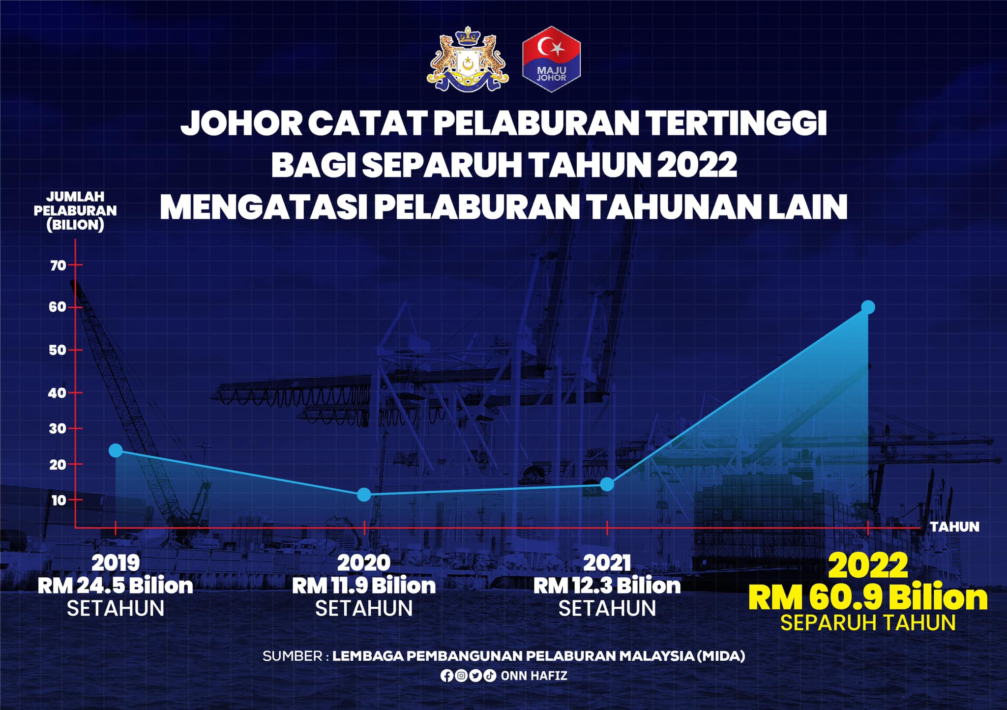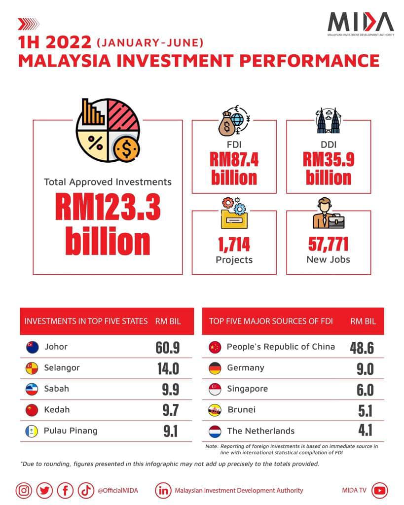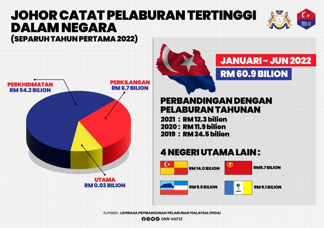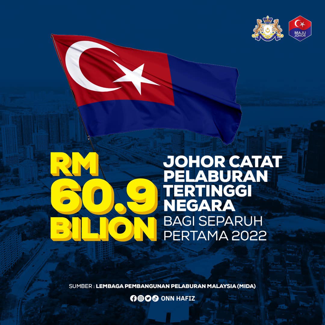 柔佛州务大臣拿督翁哈菲兹前日在面子书指出,据马来西亚投资发展局(MIDA)数据,在各方的努力下,柔佛州在 2022年上半年录得 609 亿令吉的最高投资额,较去年同期投资增长 822%。