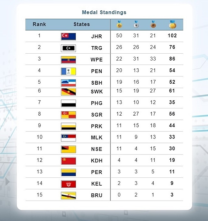 截至今晚奖牌榜,柔佛以50金、31银、21铜,总计1002面奖牌居榜首,遥遥领先其他州属。