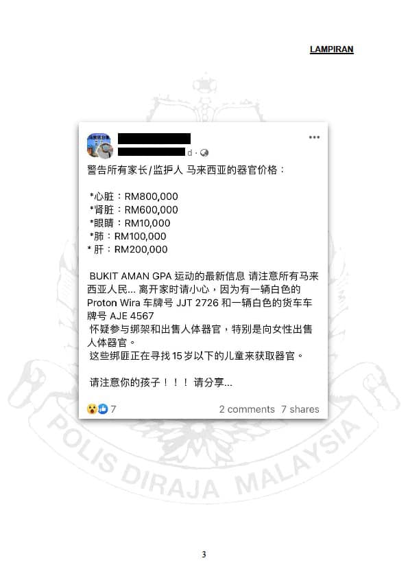 有关贴文宣称,武吉阿曼运动最新消息,请所有大马人离开家时注意,因为有一辆白色国产威拉轿车(柔佛注册车牌)和一辆白色客货车(霹雳注册车牌)涉嫌绑架孩童。